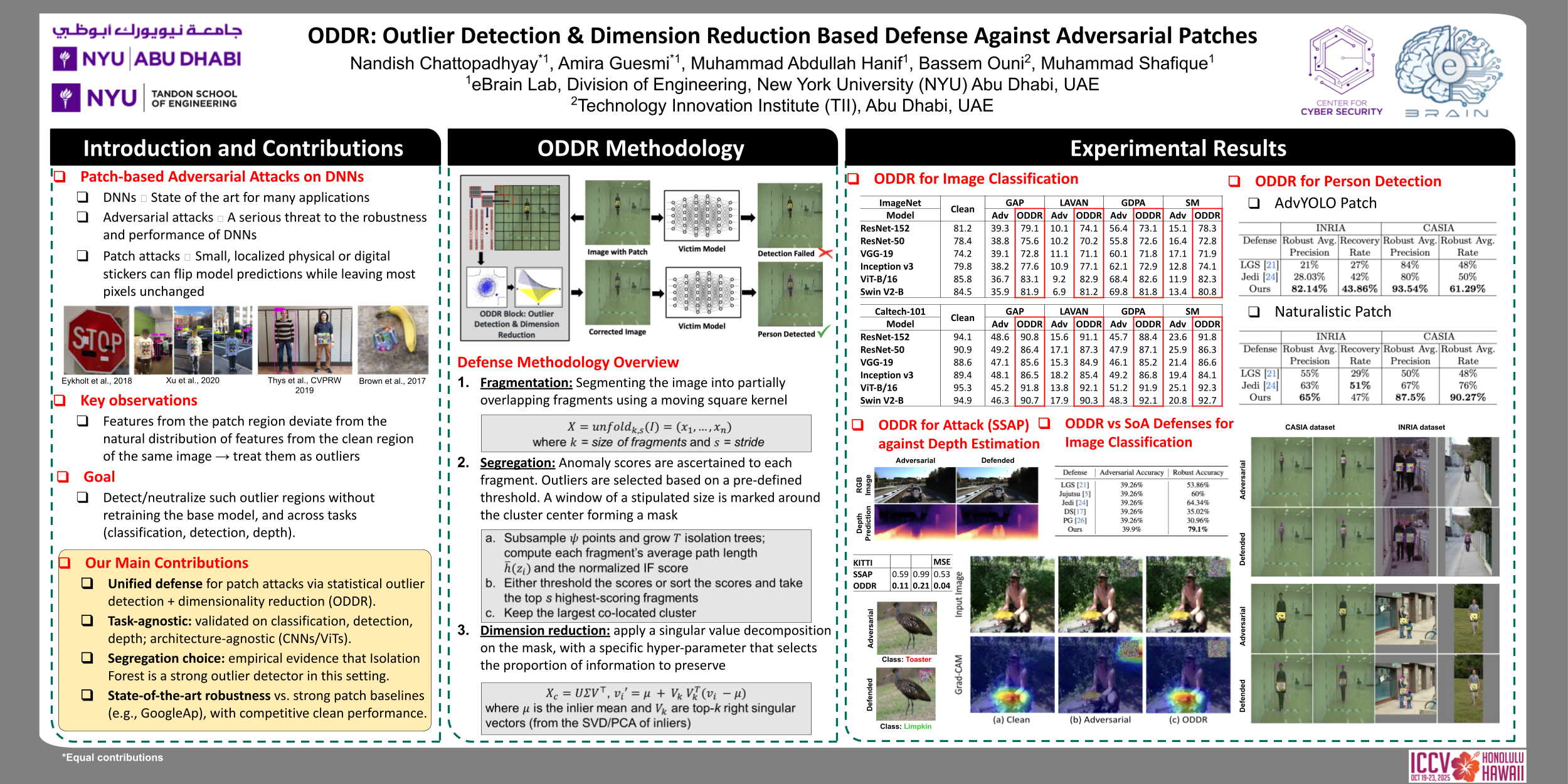```bibtex @inproceedings{guesmi2025oddr, title = {ODDR: Outlier Detection \& Dimension Reduction Based Defense Against Adversarial Patch Attacks}, author = {Guesmi, Amira and Ouni, Bassem and Shafique, Muhammad}, booktitle = {International Conference on Computer Vision (ICCV)}, year = {2025} }